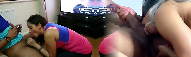 Super-sexy gym girlfriend gives blowjob swallows cum boyfriend plays Apex Legends