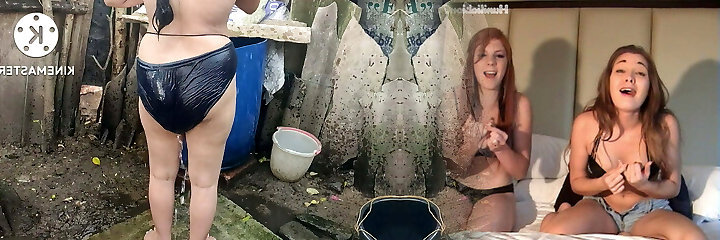 Hot indian building wife bathing outside and washing clothes